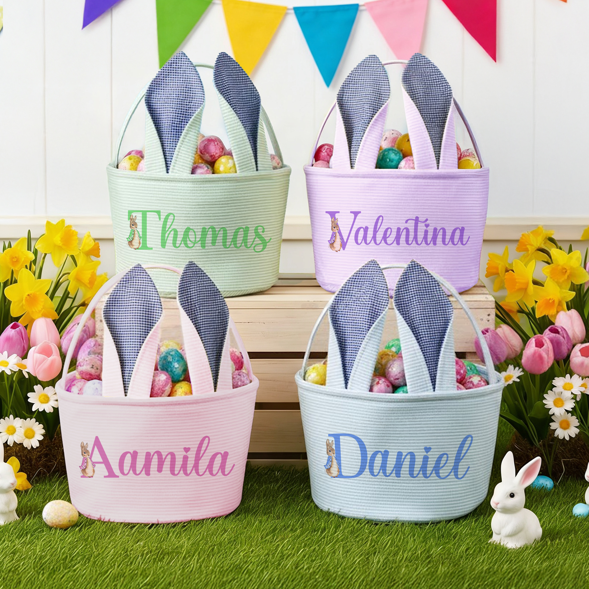 | Stijl | Paasmandje met Peter Rabbit-alfabet en konijnenoortjes, gepersonaliseerd met naam |