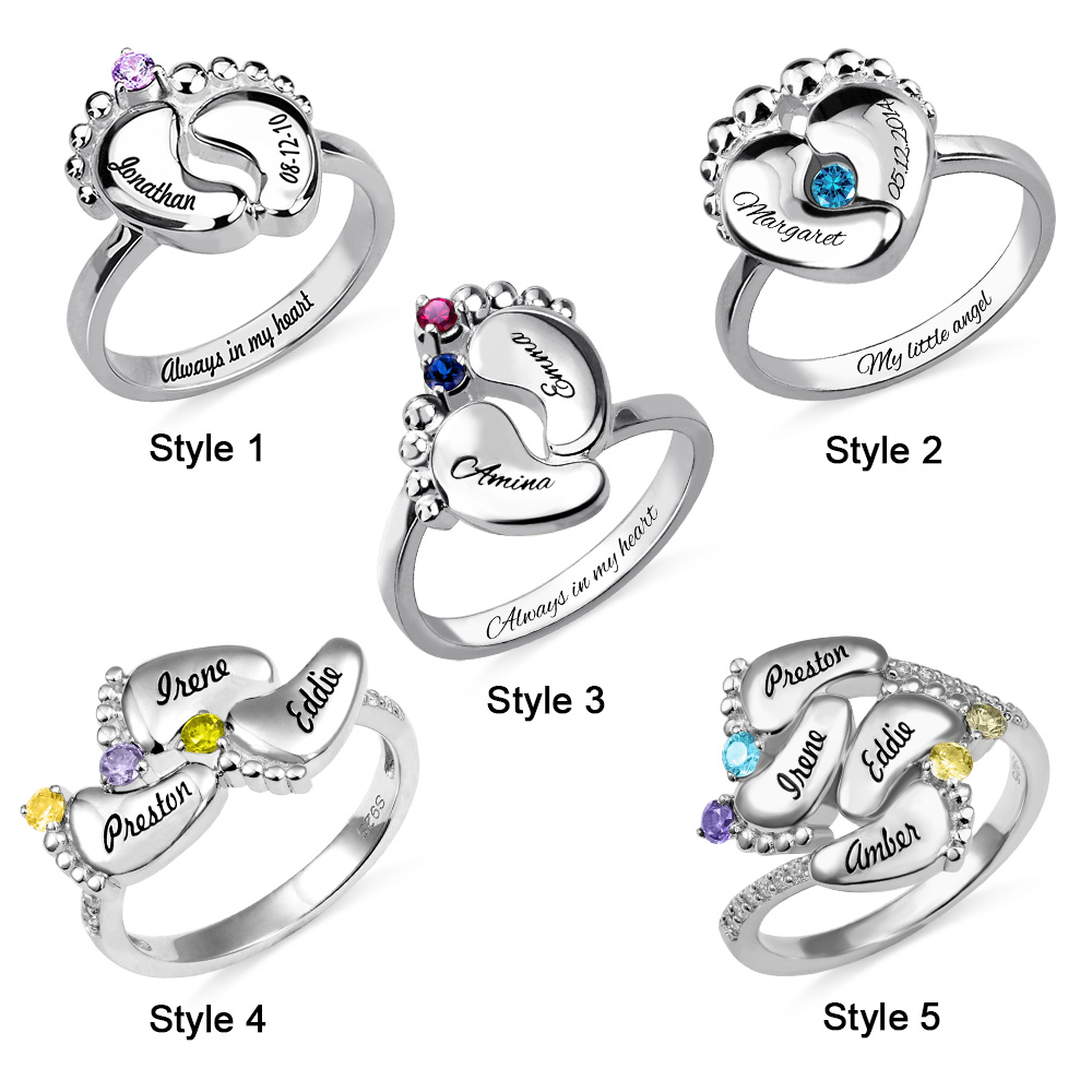 Voor elke nieuwe moeder is de babyvoetjesring met geboortestenen een geweldige manier om te pronken met je baby! Het is ook een geweldig Moederdagcadeau. Twee schattige babyvoetjes kunnen worden gegraveerd met een naam of datum om het extra persoonlijk te maken. Laat elke zin die je wilt zeggen in de ring zien. U kunt ook personaliseren met een geboortesteen voor elke naam om de geboorte van het kind te symboliseren. Elke moeder zou dit cadeau graag ontvangen!