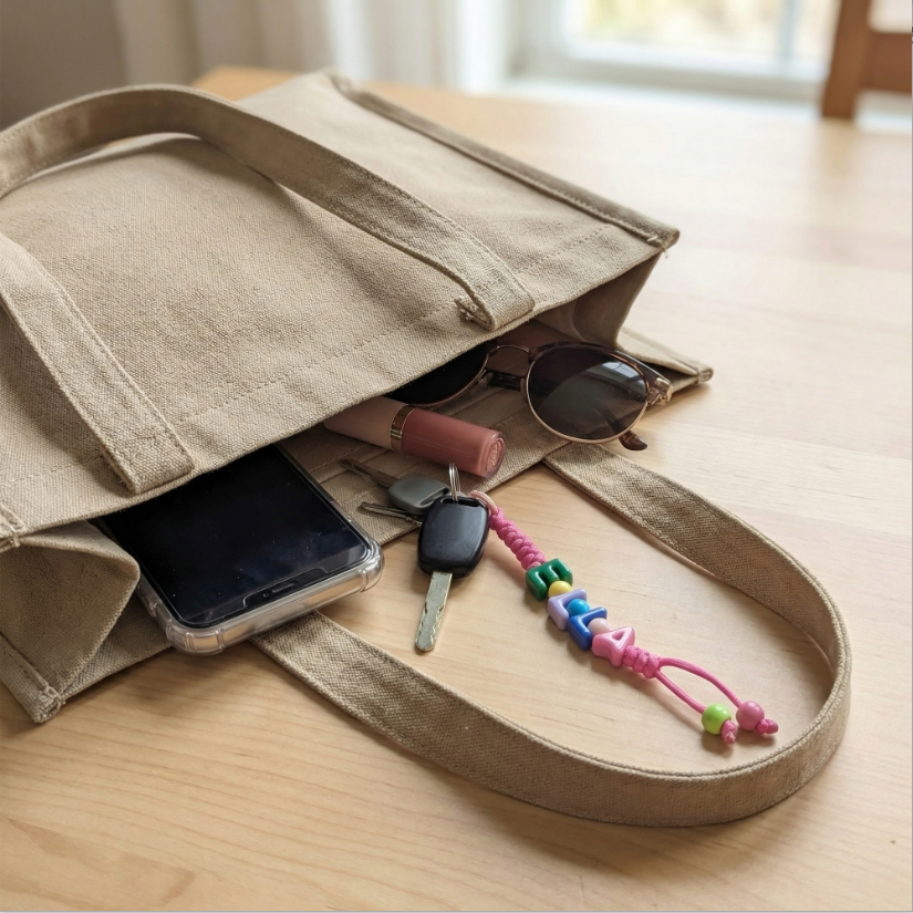 Gepersonaliseerde naam en kralenhanger – Elke sleutelhanger wordt gepersonaliseerd met de naam van een kind, zoals 'Allie', 'Miles' of 'Aria', met behulp van heldere, dikke letters en kleurrijke kralen. Deze persoonlijke touch maakt de sleutelhanger uniek en gemakkelijk te herkennen.