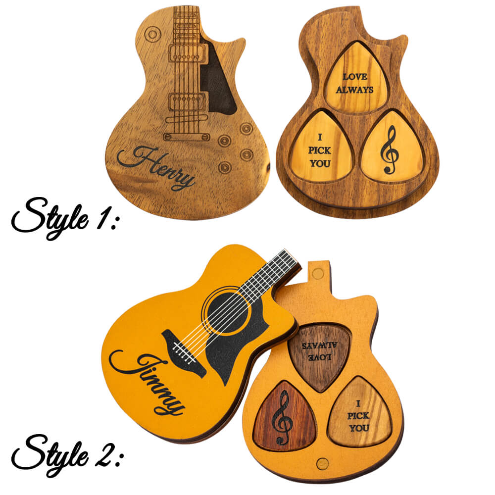 Deze gepersonaliseerde plectrums zijn een geweldig cadeau, ideaal voor gitaarliefhebbers over de hele wereld! Gemaakt van natuurlijk hout om je gitaar speciaal te laten klinken. U kunt de tekst of het pictogram op de picks aanpassen. De plectrums worden in een gitaarvormige houten kist geplaatst die er schilderachtig en dicht bij de natuur uitziet en die de natuur inspireert bij het maken van muziek. De kit bevat 3 plectrums en één koffer.